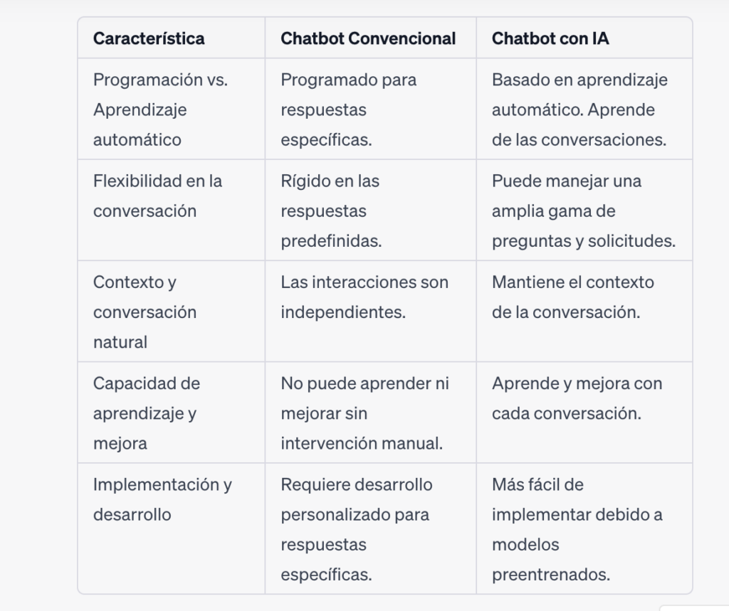 - Chatbot convencional: Los chatbots convencionales suelen requerir un desarrollo más específico y una programación detallada para cada posible respuesta.