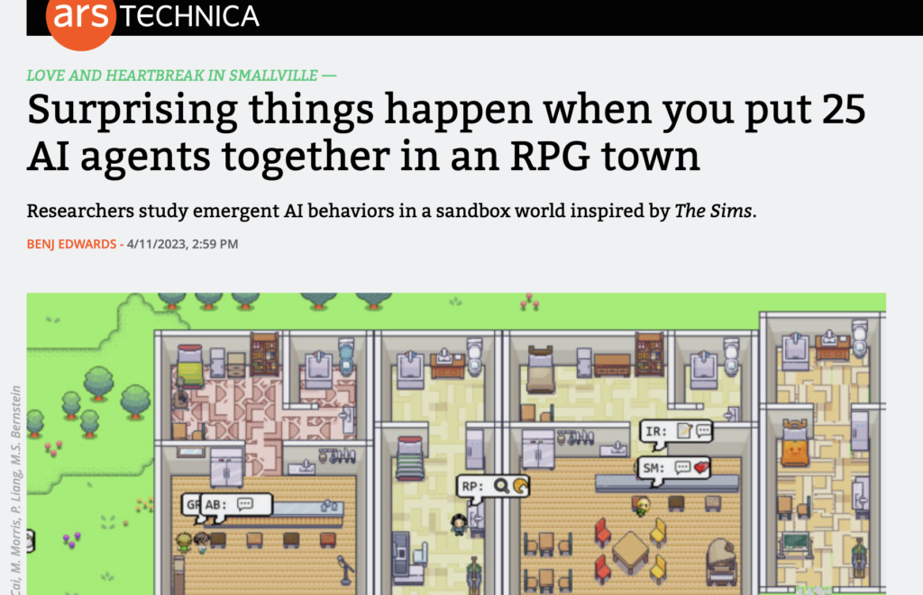 Academia VK 3.0 – Inteligencia Artificial autonoma April 13, 2023 No Comments https://agentgpt.reworkd.ai/ Crear tu PROPIA IA autonomo https://arstechnica.com/information-technology/2023/04/surprising-things-happen-when-you-put-25-ai-agents-together-in-an-rpg-town/ https://arxiv.org/pdf/2304.03442.pdf https://reverie.herokuapp.com/arXiv_Demo/ PrevPrevious Modulo de Entrenamiento Academia Vionika NextConfiguracion de VIMEO para VIONIKONext Leave a Reply Cancel replyYour email address will not be published. Required fields are marked *Comment * Name * Email * Website Save my name, email, and website in this browser for the next time I comment.